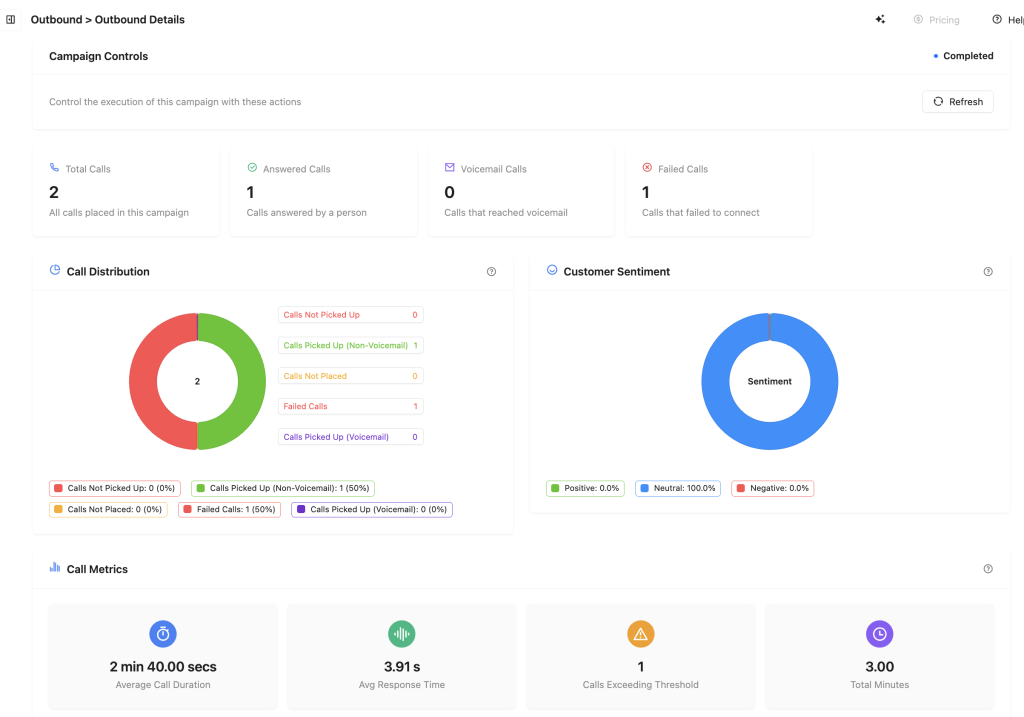 Connection rates, talk time, sentiment, outcomes, Post call insights all will be available in Voicegenie dashboard.